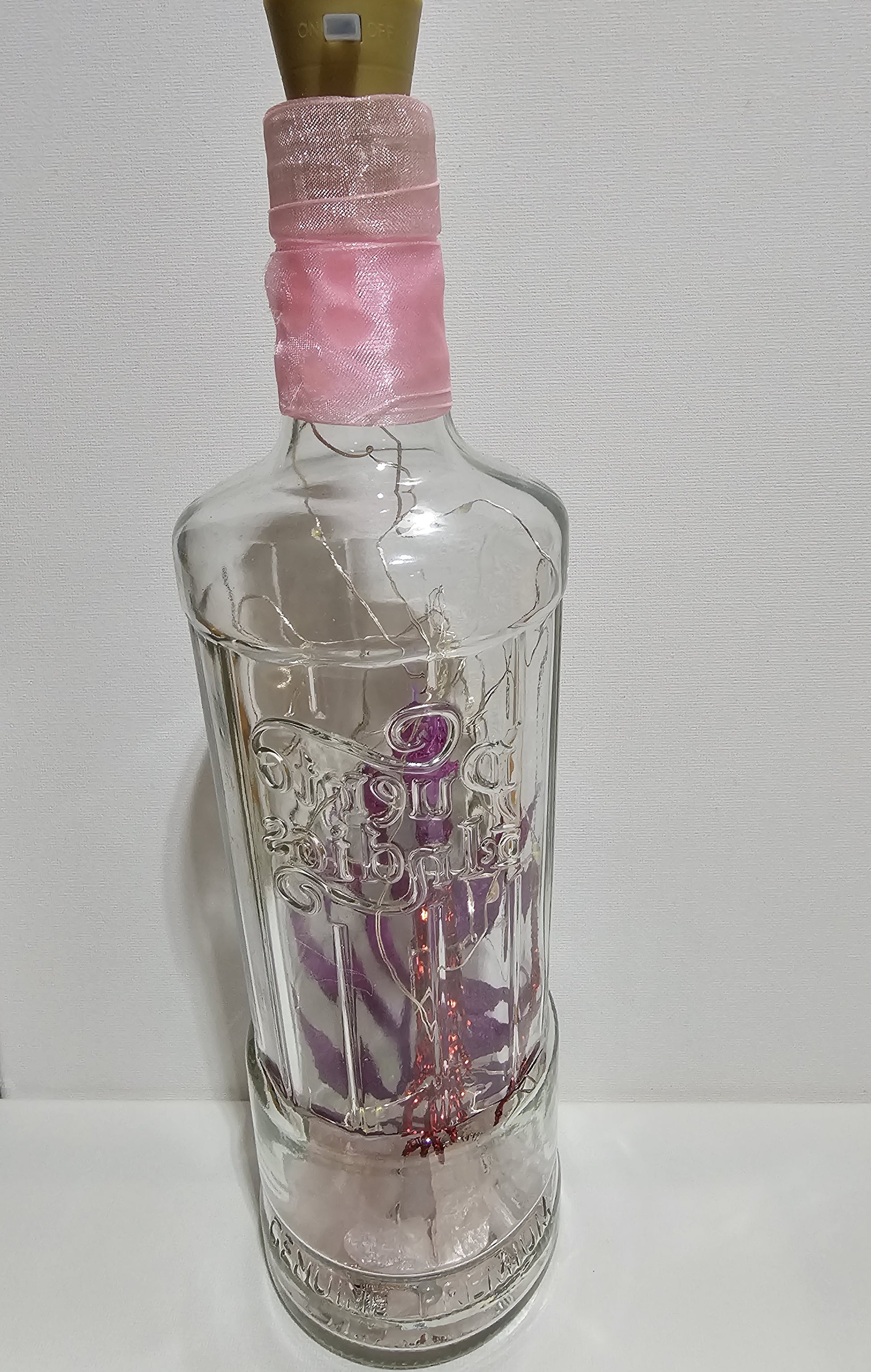 Fairy light bottle decor using an upcycled liquor bottle. Multicolored light, solar powered.